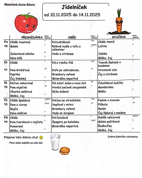 Samozřejmostí je dodržování pitného režimu. Děti mají po celý den k dispozici výběr z několika druhů nápojů, včetně vody.