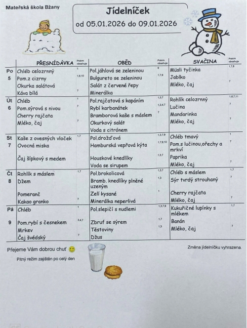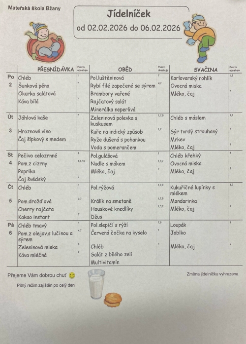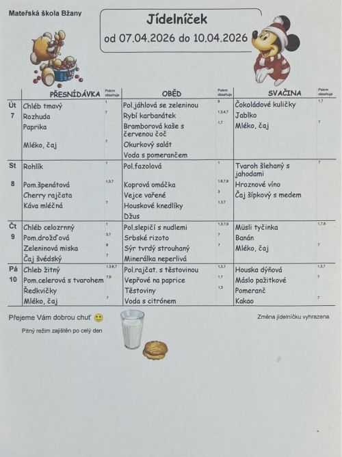 Samozřejmostí je dodržování pitného režimu. Děti mají po celý den k dispozici výběr z několika druhů nápojů, včetně vody.